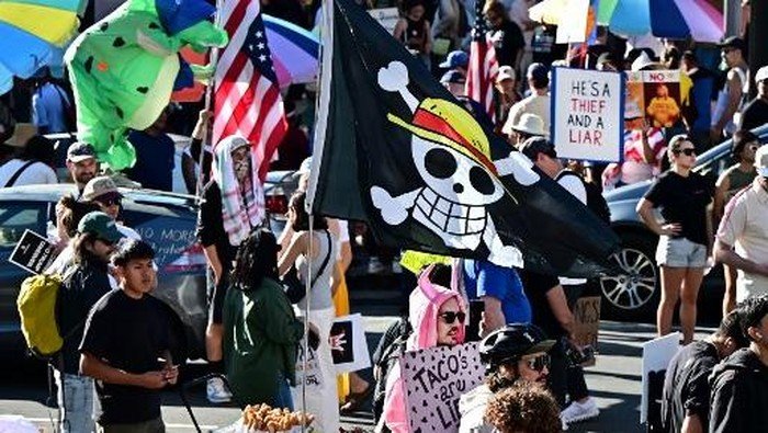 ‘No Kings’ menggema di Amerika, bendera One Piece muncul di tengah aksi demo. (Istimewa)PRIORITAS, 20/10/25 (Jakarta): Dari New York hingga Los Angeles, lautan manusia membanjiri jalanan Amerika Serikat. Di antara spanduk “Protect Democracy” dan “Trump Must Go!”, satu bendera mencuri perhatian—bendera tengkorak bajak laut dari anime legendaris One Piece.
