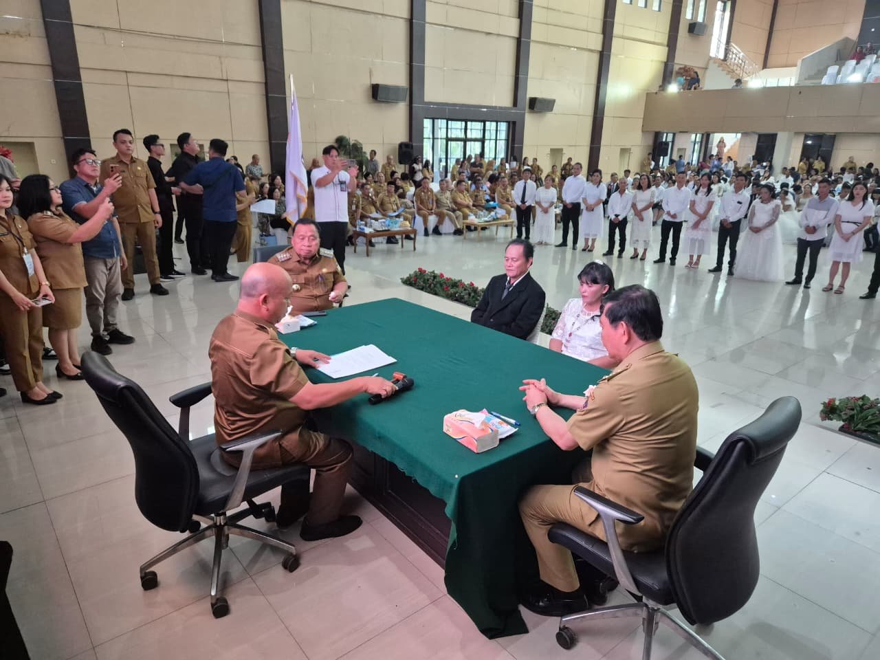 Nikah massal yang digagas Pemprov Sulut ini berlangsung di Graha Bumi Beringin Manado, Selasa (14/10/2025). Pencatatan dilakukan langsung Kadis Kependudukan dan Pencatatan Sipil, Meidy Rengkuan.