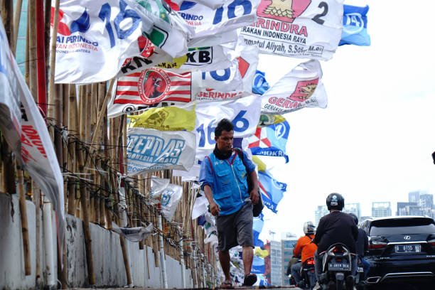 Warga melintas di jalanan Jakarta yang dipenuhi bendera partai politik menjelang Pemilu 2024 pada Rabu (23/1/24). (Anadolu/Getty Images)PRIORITAS, 6/9/25 (Jakarta): Peneliti GREAT Institute Hanief Adrian menegaskan keputusan DPR RI terkait 17+8 Tuntutan Rakyat hanya meredam masalah di permukaan.