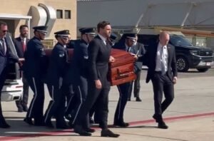 Wakil Presiden AS JD Vance juga membawa peti jenazah Charlie Kirk, bersama para pengusung jenazah lainnya, di landasan bandara. Mereka berjalan bersama peti jenazah menuju Air Force Two. Jenazah Kirk diangkut dari Utah ke Phoenix, Arizona, pada hari Kamis.