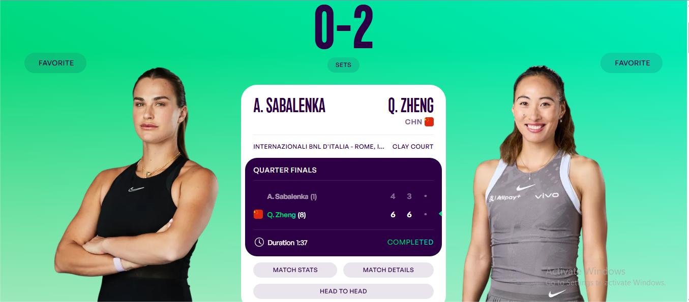 Hasil pertandingan Zheng vs Sabalenka di Italian Open 2025. (WTA)