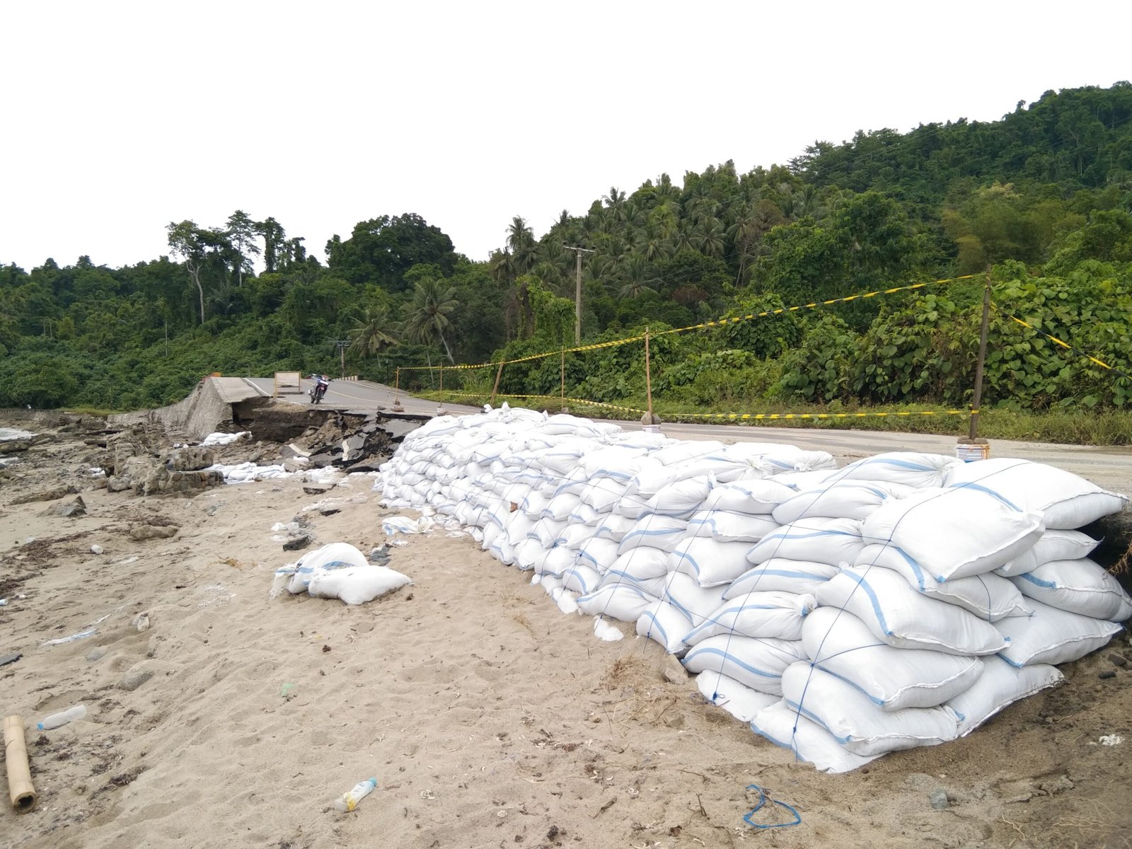 Kepala Balai Pelaksana Jalan Nasional (BPJN) Sulteng, Bambang Razak ST, MT, mengatakan saat ini ruas jalan yang mengalami kerusakan akibat abrasi sudah ditangani pihaknya dengan penanganan sementara menggunakan sandbag (karung pasir).