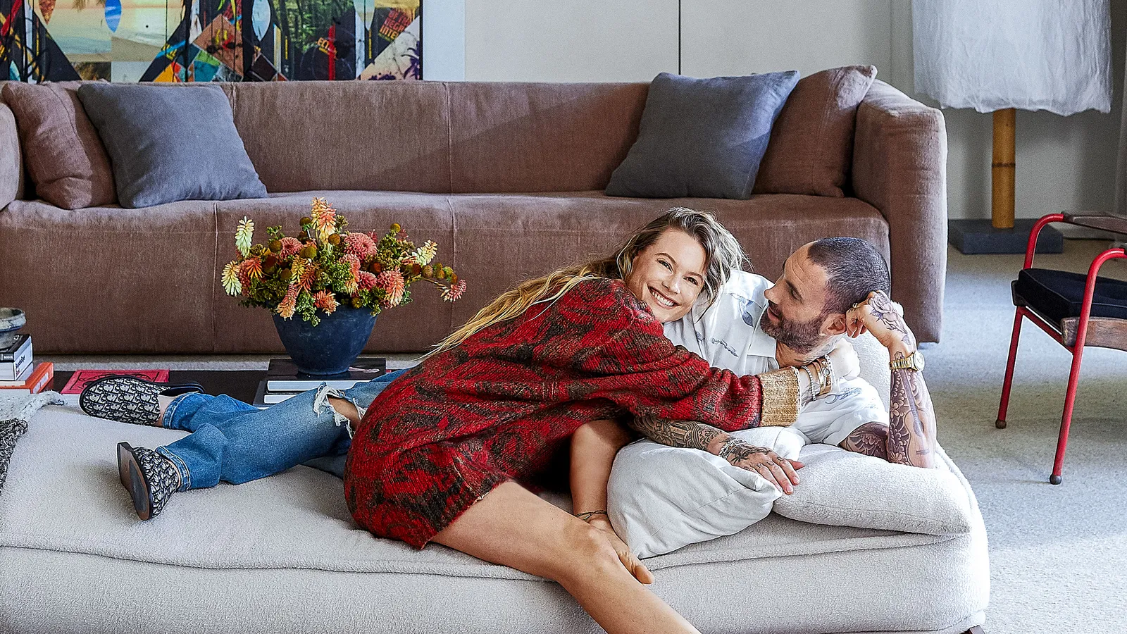 Pasangan pesohor Behati Prinsloo dan Adam Levine di salah satu bagian ruang keluarga rumah mewah mereka. (Courtesy: architecturaldigest.com)