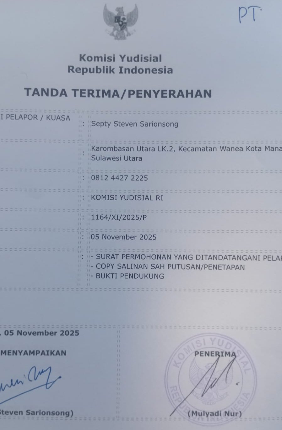 PRIORITAS, 05/11/25 (Manado) : Laporan pengaduan 208 mantan kepala lingkungan di Manado, atas enam oknum hakim, resmi masuk ke Komisi Yudisial (KY) Republik Indonesia.