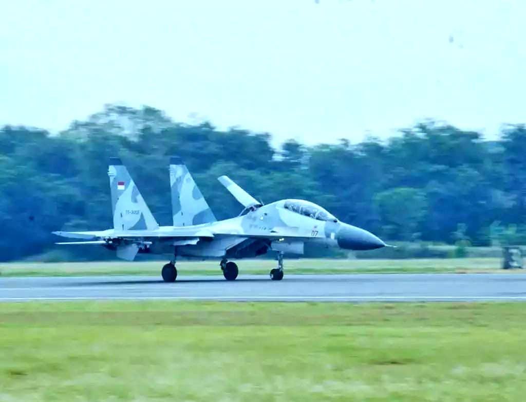 Pesawat jet tempur Sukhoi Su-27/30 dari Skadron Udara 11 Lanud Sultan Hasanuddin digunakan dalam latihan ‘force down’ atau memaksa turun pesawat asing di kawasan industri Morowali, Sulteng. (Ist.)PRIORITAS, 20/11/25 (Morowali, Sulawesi Tengah): Menteri Pertahanan RI, Sjafrie Sjamsoeddin, didampingi Gubernur Sulawesi Tengah, Anwar Hafid, menyaksikan langsung jalannya operasi force down latihan Komando Gabungan (Kogab) TNI 2025. Latihan di Bandara PT IMIP, Morowali, Sulawesi Tengah, ini diadakan untuk memperkuat keamanan kawasan industri strategis di Morowali.