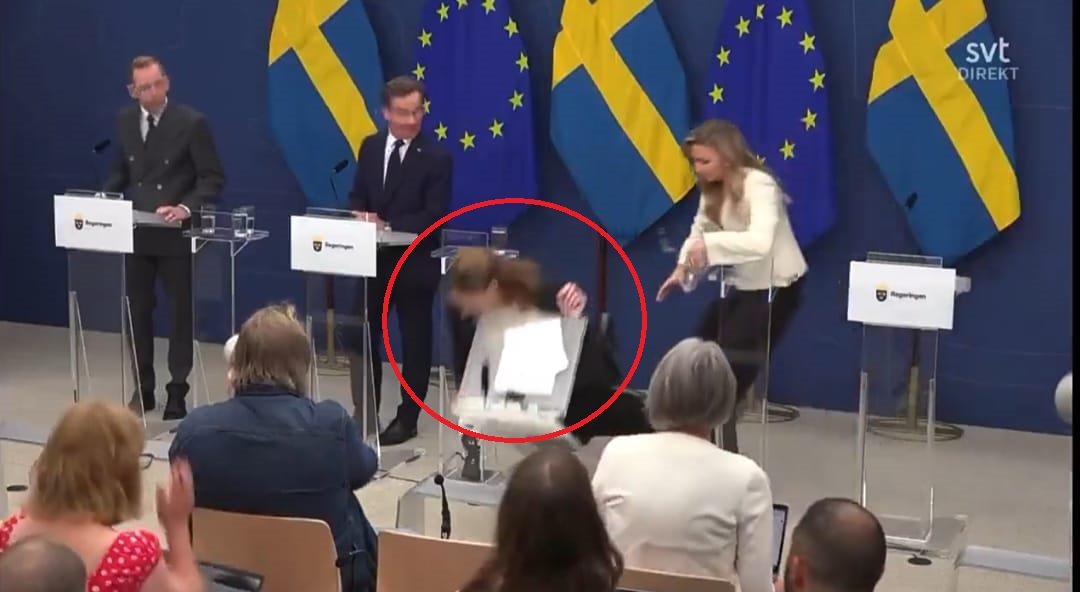 Insiden itu terjadi saat wanita berusia 48 tahun itu berdiri di samping Perdana Menteri Swedia Ulf Kristersson dan pemimpin partai Kristen Demokrat Ebba Busch, untuk menjawab pertanyaan dari wartawan.