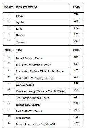 Pada Klasemen Akhir Konstruktor, berkat pencapaian luar biasa Marc Marquez dan sedikit dibantu Fransesco “Pecco” Bagnaia, Ducati bertengger megah di posisi puncak dengan poin 768, jauh meninggalkan Aprilia di posisi kedua dengan nilai 418.