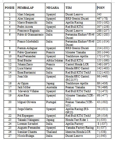 Di kelas Moto2 ini, satu-satunya pembalap Indonesia yang ikut dalam Kejuaraan Dunia MotoGP 2025, Mario Suryo Aji di bawah bendera Idemitsu Honda Tim Asia, berada di peringkat ke-26 dengan 8 poin.