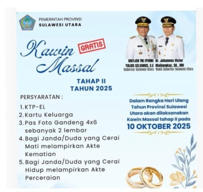 PRIORITAS, 6/10/25 (Manado) : Pemerintah Provinsi (Pemprov) Sulawesi Utara (Sulut) kembali membuka pendaftaran bagi program Kawin Massal Gratis yang merupakan tahap kedua.