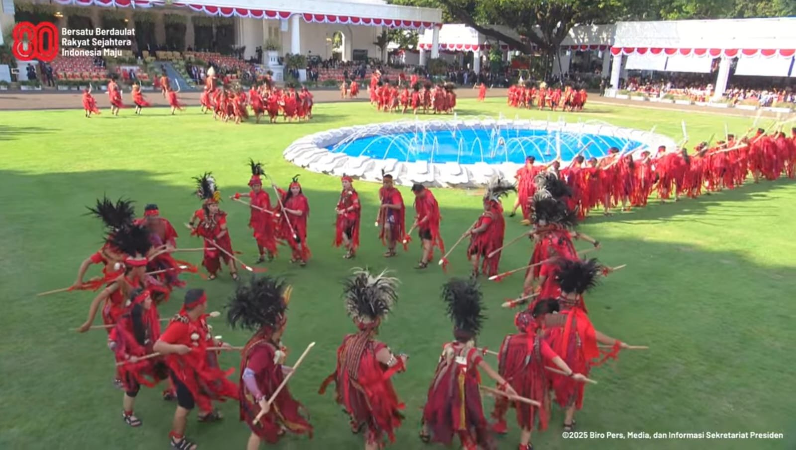 Sebanyak 200 orang penari perang kabasaran Minahasa tampil memukau di halaman Istana Merdeka Jakarta, Minggu 17 Agustus 2025. (Screenshot video BPMI Setpres)