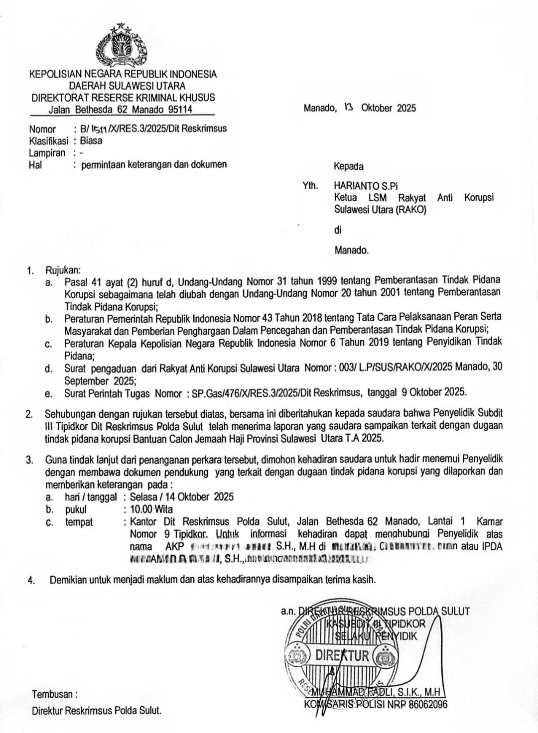 Lewat surat nomor 1511/X/Res.3/2025/Ditreskrimsus bertanggal 13 Oktober, Polda Sulut sudah melayangkan surat panggilan kepada Harianto selaku Ketua LSM Rako.