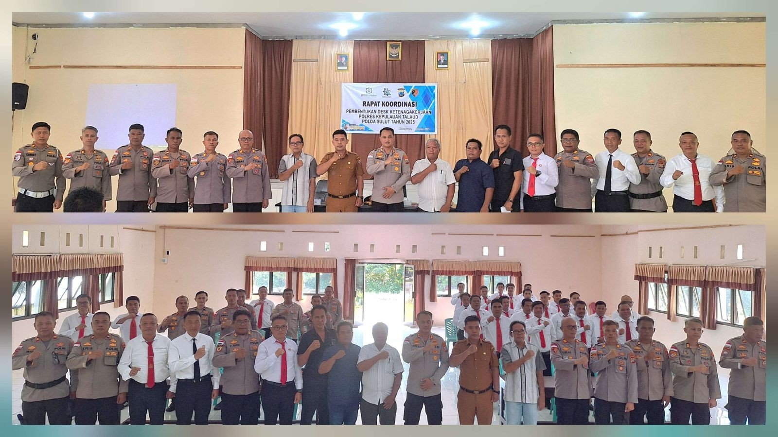Peserta Rakor pembentukan desk ketenagakerjaan foto bersama usai acara.(Beritaprioritas.com)PRIORITAS, 27/10/25 (Talaud): Kapolres AKBP Arie Sulistyo Nugroho, SIK., MH membuka secara resmi Rapat Koordinasi ( Rakor) Pembentukan Desk Ketenagakerjaan Polres Kepulauan Talaud Polda Sulut tahun 2025.