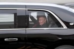 Vladimir Putin terlihat tersenyum saat naik mobil dinas Donald Trump di Alaska, Jumat 15 Agustus 2025.(theindependent)