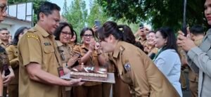 Usai memimpin apel, Wawali Sendy Rumajar saat turun dari mimbar upacara, langsung disambut dengan kue ulang tahun oleh Sekretaris Daerah Kota (Sekdakot) Edwin Roring.