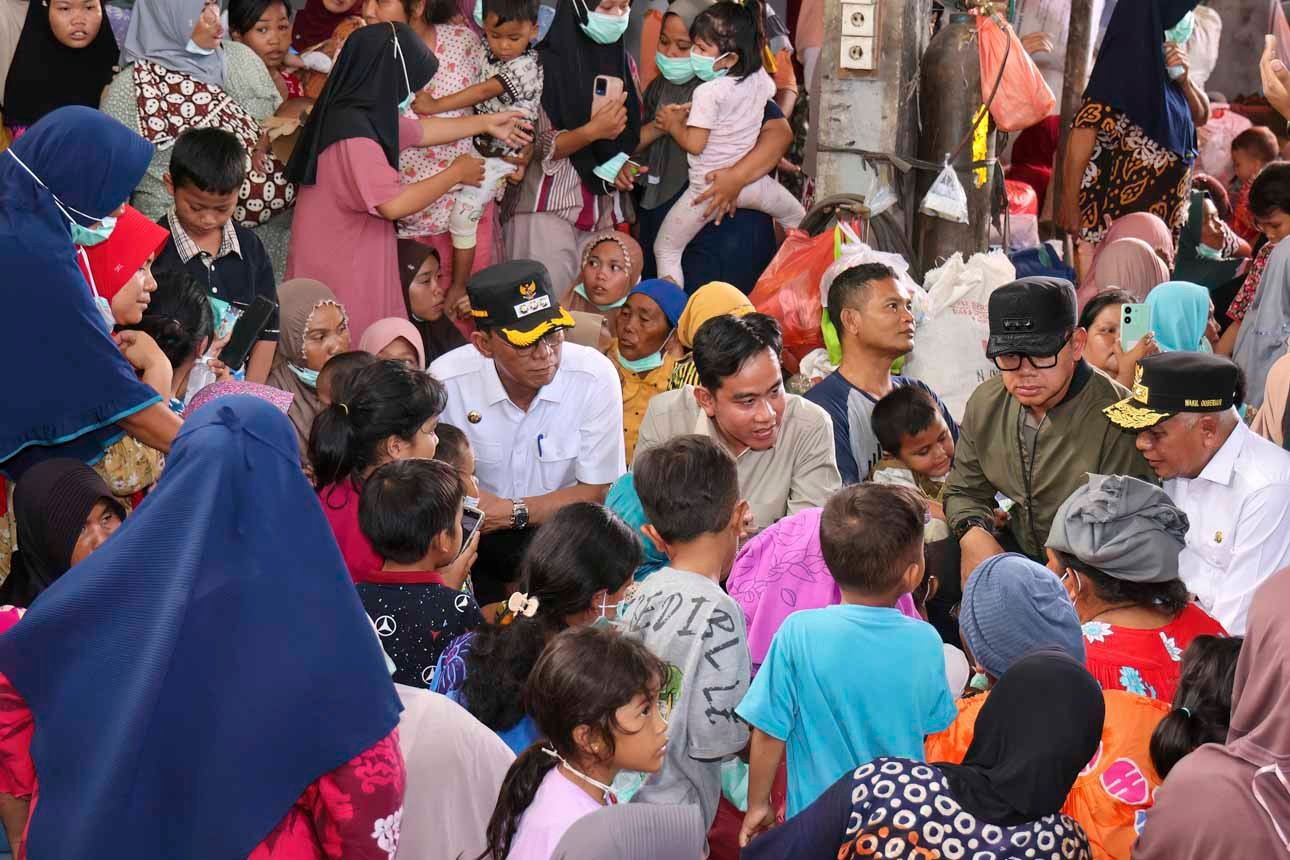 Di tengah kerumunan korban, Gibran tampak seksama mendengarkan keluhan yang disampaikan. Sesekali Gibran mendekatkan kepalanya kepada salah satu pengungsi, karena suara di posko pengungsian yang saling bersahutan.